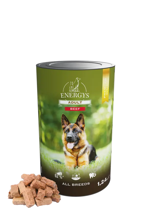 hús és állati eredetű termékek (62 % darabokban*, ebből 8 % marhahús), gabonafélék, ásványi anyagok, cukrok.