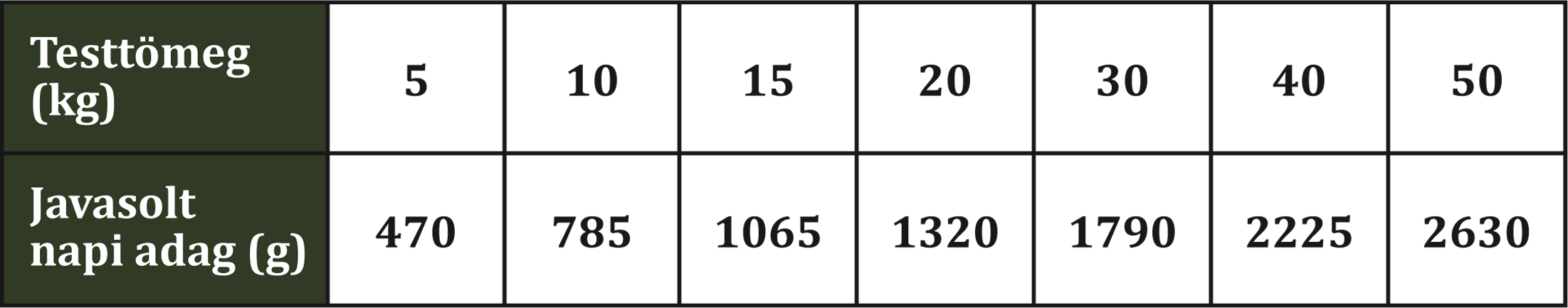 Ez az útmutató csak tájékoztató jellegű. Kutyájának egyéni szükségletei életkortól, fajtától, testállapottól és aktivitástól függően változhatnak. Ideális esetben a takarmányadagot ossza el 1-2 adagra. Kezdetben a táblázatban megadott mennyiségeknek megfelelően adagolja az eledelt, és fokozatosan módosítsa, hogy kutyája karcsú maradjon. Ha új eledelre vált, a változtatásokat fokozatosan, 7-10 nap alatt vezesse be, fokozatosan növelve az új eledel arányát minden nap. Legjobb, ha szobahőmérsékleten eteti.